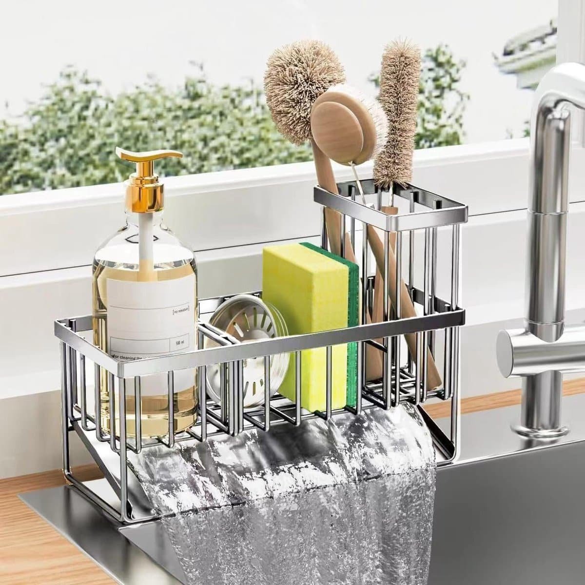 Met Borstelhouder De keuken gootsteen organizer is voorzien van een borstelhouder, zodat grote en kleine borstels overzichtelijk kunnen worden opgeborgen.