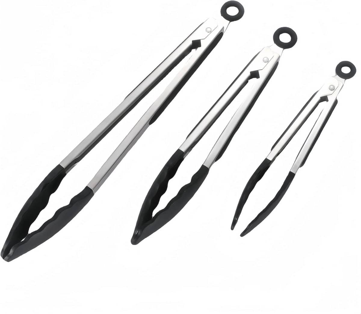 Deze veelzijdige 3-delige set roestvrijstalen grilltangen is perfect voor grillen en koken. Ideaal voor het omdraaien van vlees, groenten en het serveren van gerechten. De BPA-vrije siliconen spuitmonden zijn hittebestendig tot 480 graden Celsius, waardoor je kookgerei veilig en beschermd blijft. Gemaakt van robuust roestvrij staal voor een stevige grip en corrosiebestendigheid. Het vergrendelingsmechanisme voorkomt per ongeluk openen tijdens het opbergen. Bovendien zijn de tangen eenvoudig te reinigen; ze zijn vaatwasmachinebestendig en de siliconen opzetstukken zijn vaatveilig.