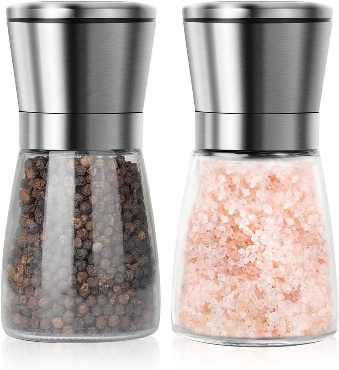 RVS zout en pepermolen set met glazen houder, handmatig navulbaar – verstelbare grofheid – keuken accessoires – 2 stuks