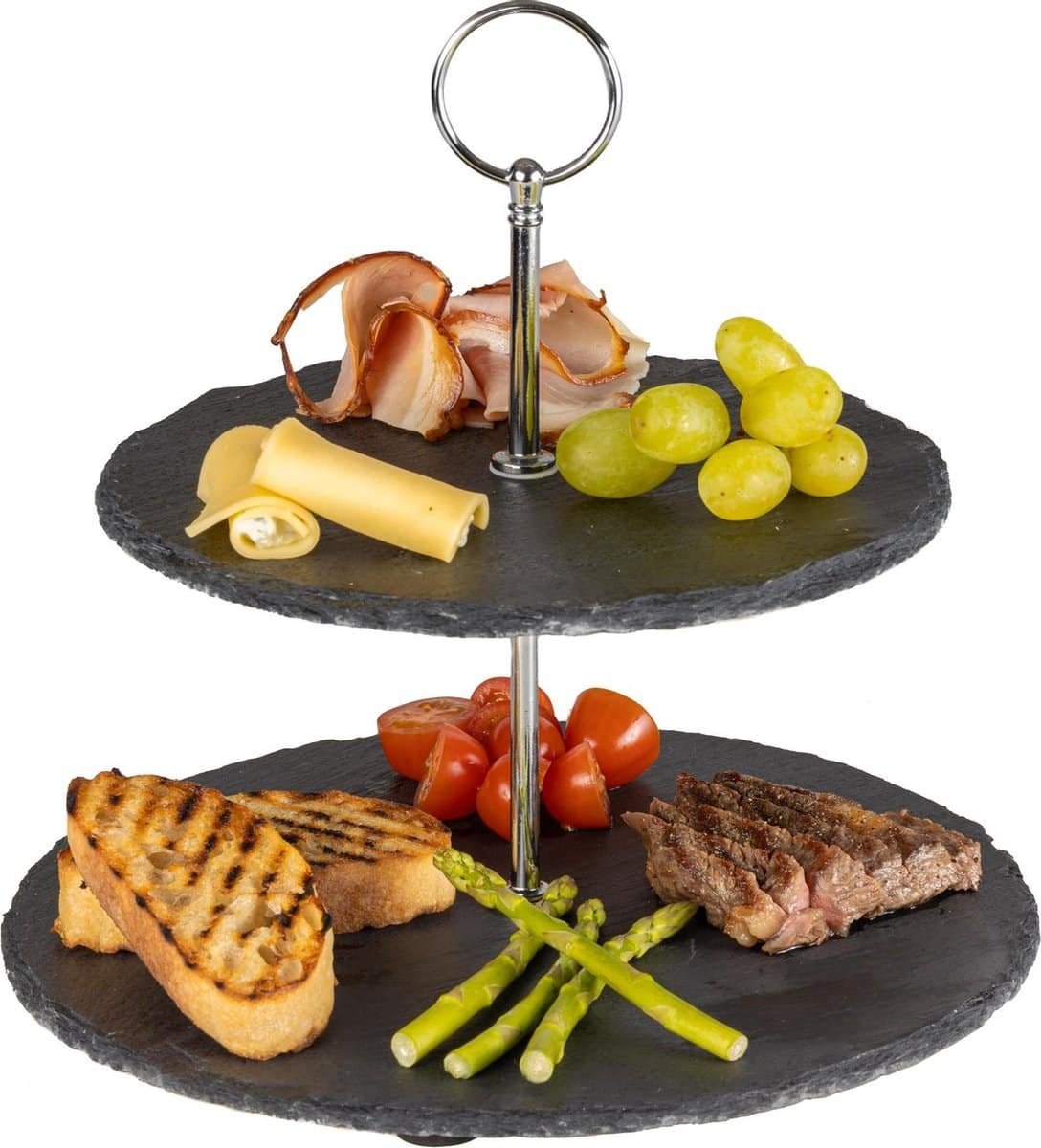 Sareva Etagere / Serveertoren Leisteen – 2-Laags serveertoren voor hapjes – Stijlvolle presentatie van snacks – Materiaal: Leisteen en RVS – Diameter: 200 & 220 mm – Hoogte: 250 mm – Tafelaccessoires – Keuken accessoires