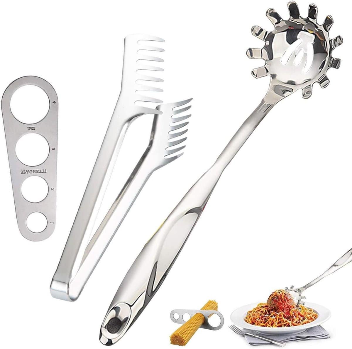Spaghettiserverset – RVS Spaghettitang, Pasta lepel vork, Spaghetti Meetgereedschap Spaghettiserverset voor de perfecte pasta-ervaring Deze spaghettiserverset bevat alles wat je nodig hebt om optimaal te genieten van heerlijke pasta gerechten. Met een roestvrijstalen spaghettitang, een pasta lepel server vork en een spaghettimeetgereedschap, heb je alle benodigdheden bij de hand om smaakvolle pasta te serveren.