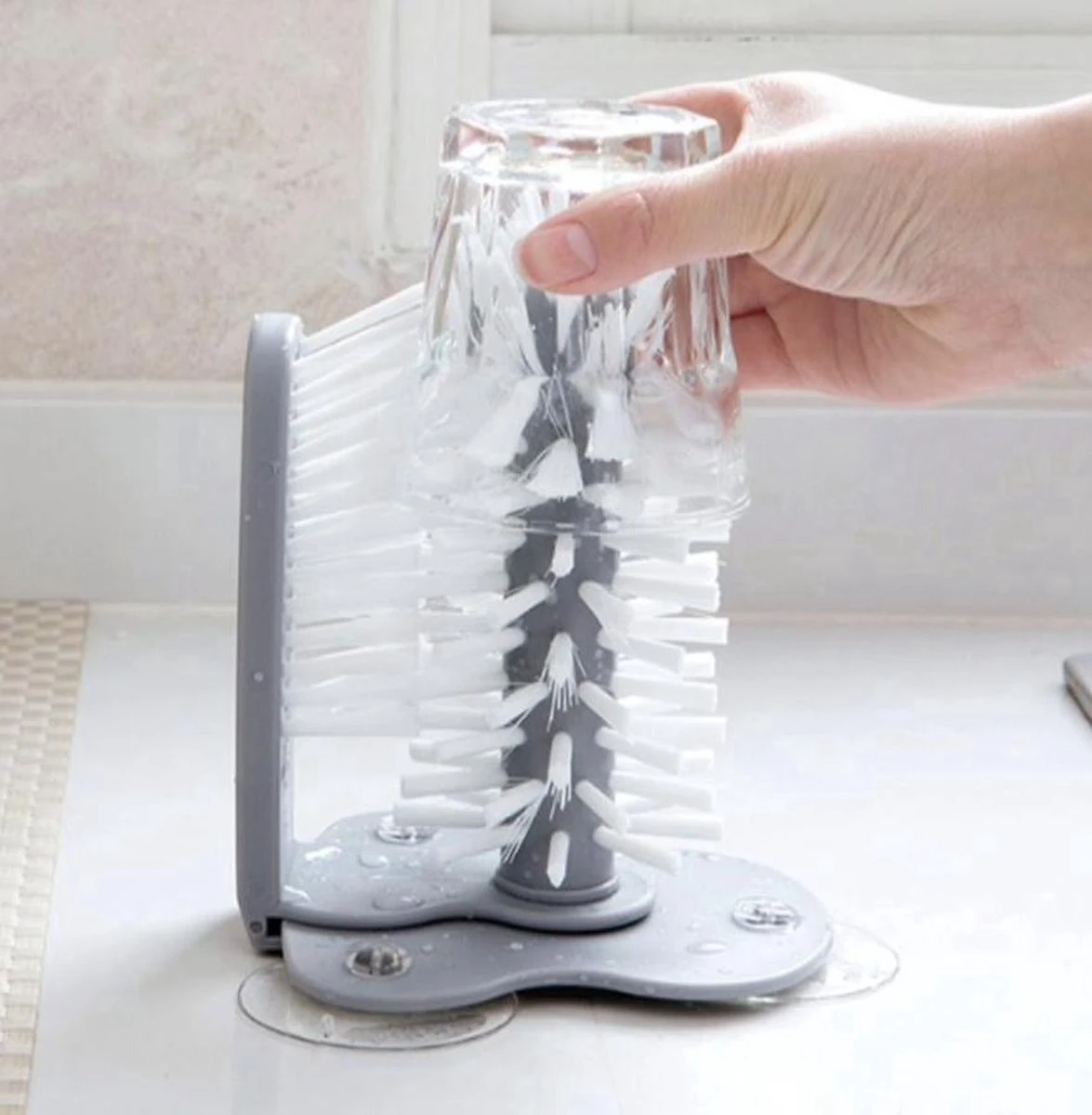 De stevige zuignappen aan de onderzijde zorgen ervoor dat de borstel goed blijft zitten in de wasbak, zodat je beide handen vrij hebt.