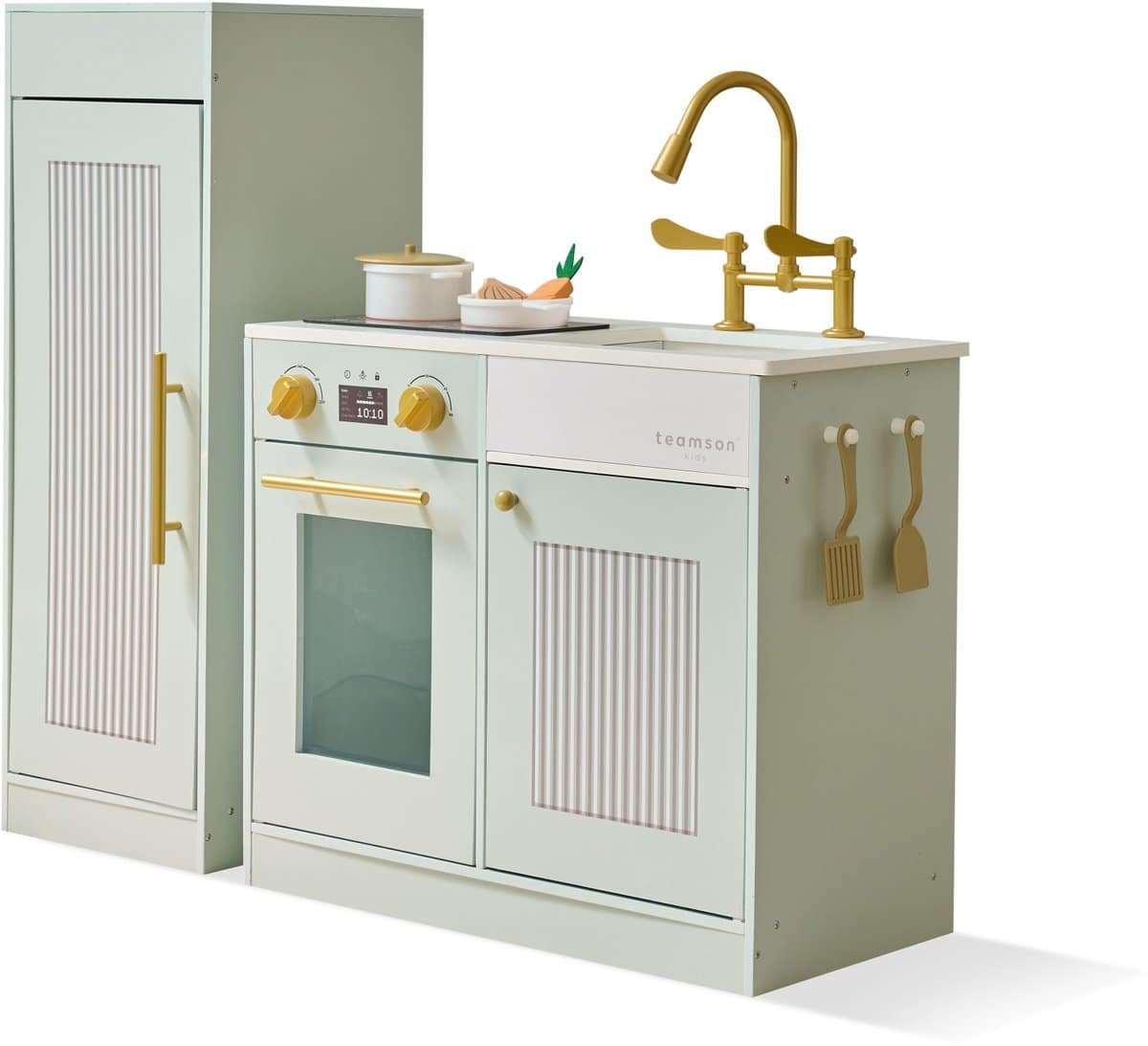 Teamson Kids Keuken Little Chef Chester groen met koelkast, fornuis, 12 accessoires, planken en haken, stimuleert samenwerking en creativiteit
