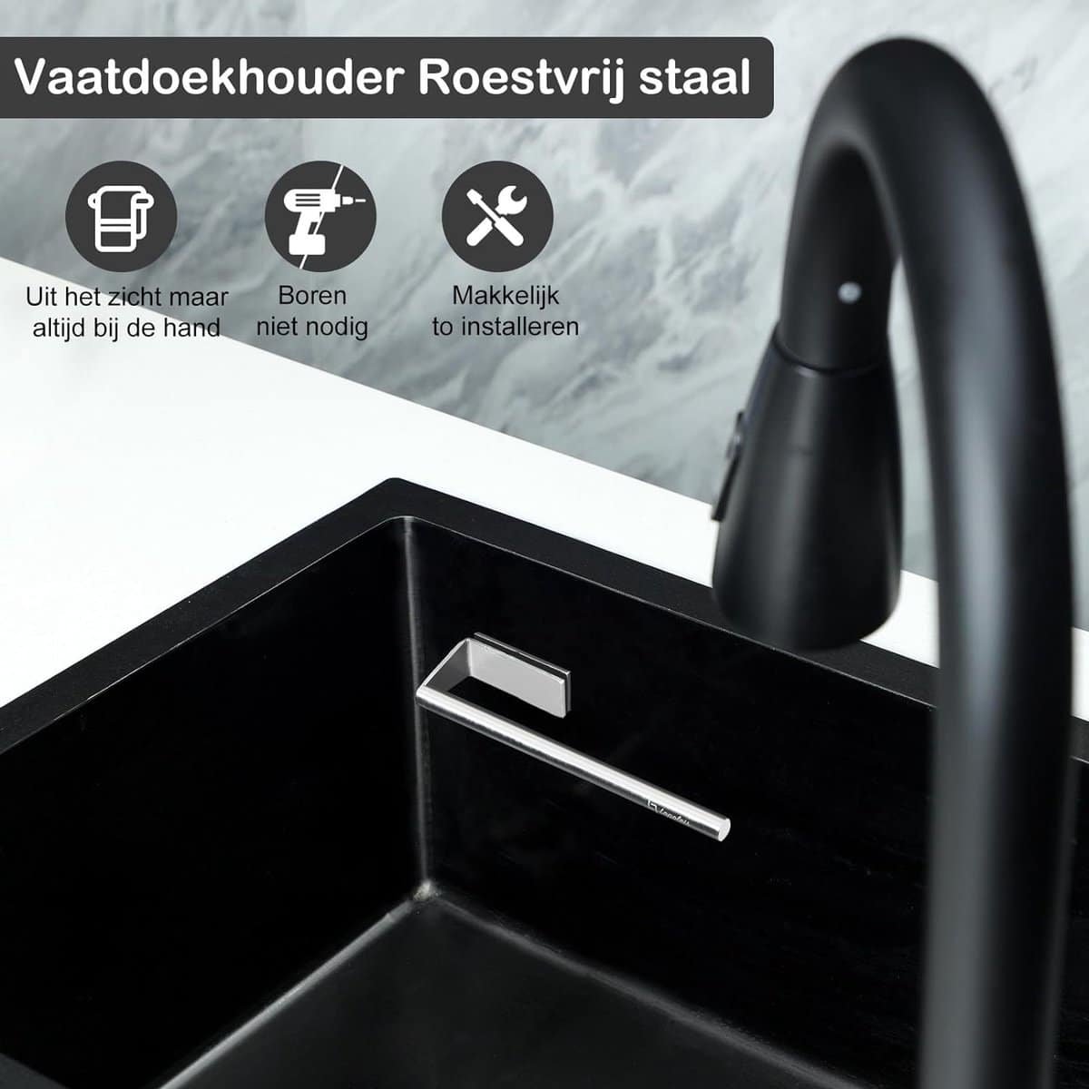 De handdoekhouder hecht stevig en maakt snel drogen mogelijk, waardoor er geen vaatdoekjes meer over de kraan in jouw nette keuken hangen.
