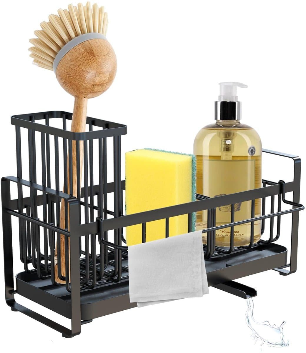 WATUNID Keuken Spoelbak Caddy, 304 RVS Sponshouder voor Keukenorganizer, Sponshouder Keuken met Verwijderbare Lekbak en Scheidingswanden, Mummiemand Keukengadgets Accessoires (Zwart)