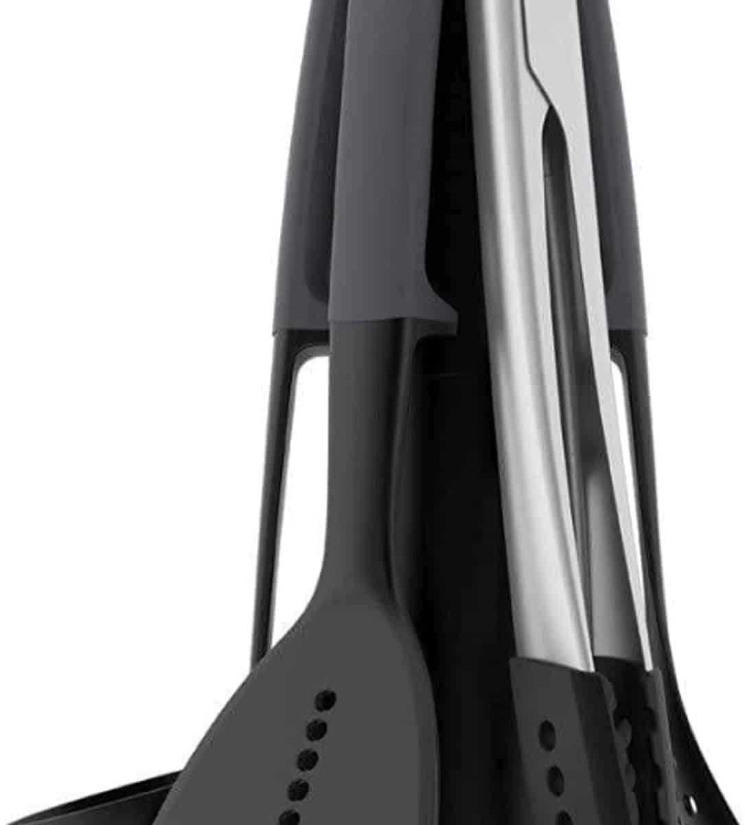 Famanu – Keukengerei & keuken gadgets set – 6 stuks met roterende houder – siliconen handgrepen – anti-aanbak kop – grijs
