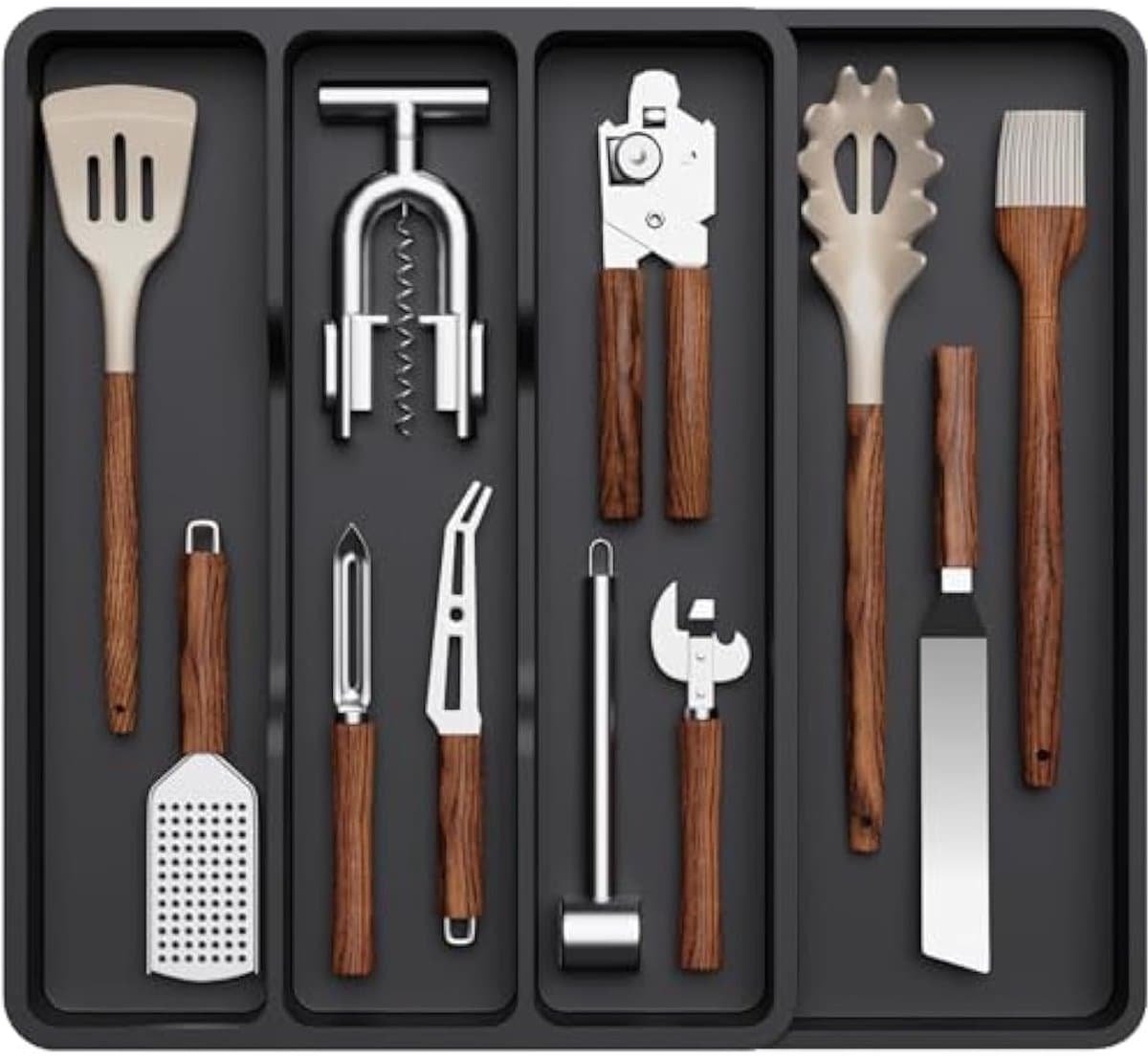 Keukengerei Lade Organizer, Uitbreidbaar Bestekbak voor Keuken, zwart, Verstelbaar ontwerp: Deze keukengerei lade organizer is ontworpen om flexibel uit te breiden van drie naar vier vakken, zodat je ruim voldoende opbergruimte hebt voor je keukengerei. Hij is verstelbaar voor lades met een breedte van 30,2-43,9 cm._x000D