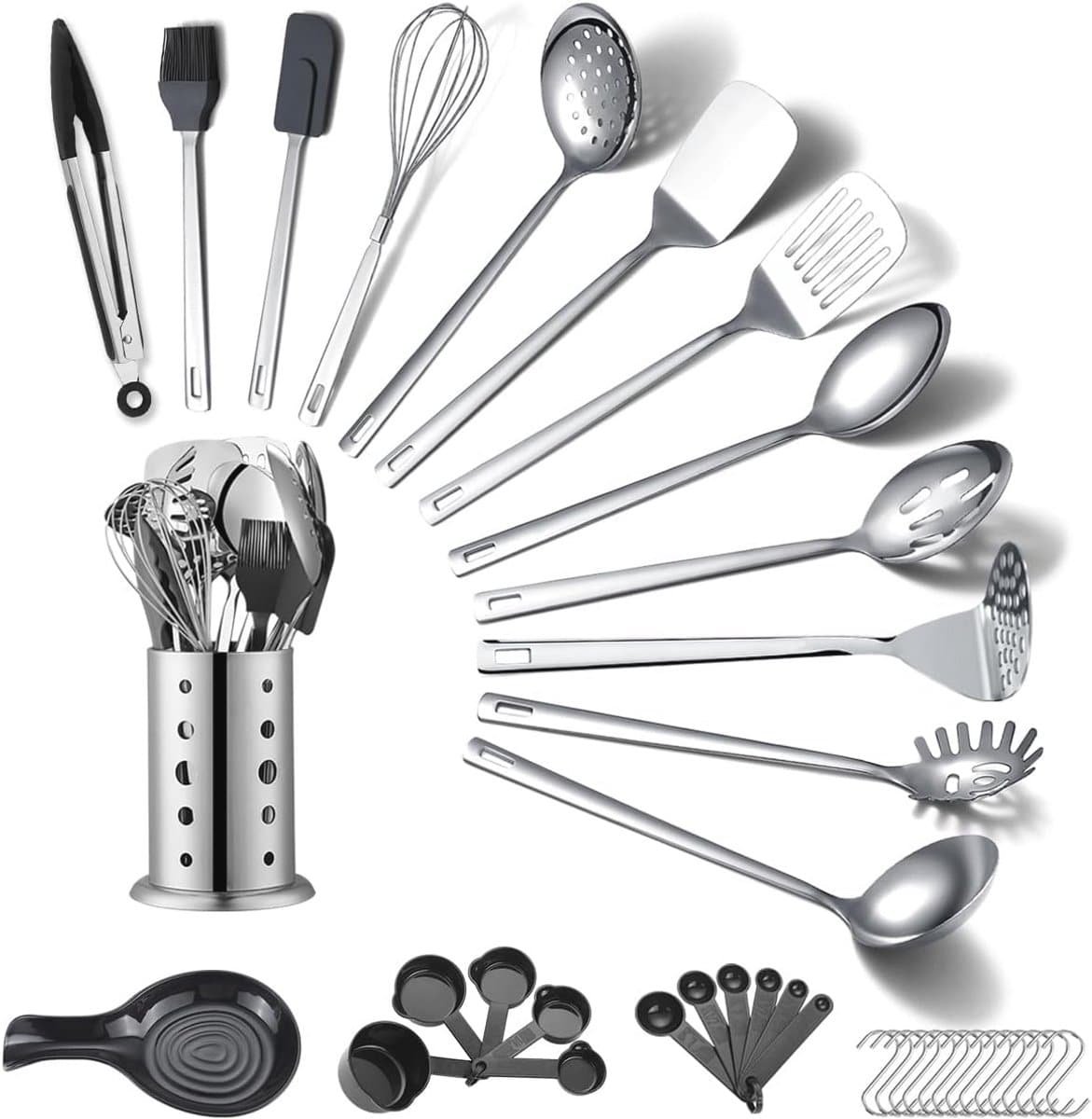 Ontdek deze uitgebreide keukengerei set van 40 stuks, perfect voor elke kookliefhebber. De set bevat allemaal essentiële kookgerei, waaronder een pastavork, sleufdraaier, stevige spatel, kooktang, rijgborstel, kookopscheplepel, schuimsplepel, soeplepel, deegspatel, garde, skithemmer, lepelsteun, en nog veel meer. Dankzij de vaatwasmachinebestendige items en de handige houder, is deze set zowel praktisch als stijlvol. Ideaal als huiswarming cadeau of voor elke nieuw huis eigenaar. Verrijk uw keuken met hoogwaardige, niet-giftige, roestvrijstalen keukengerei en accessoires! Perfect voor koken, bakken, en elke keuken behoefte.