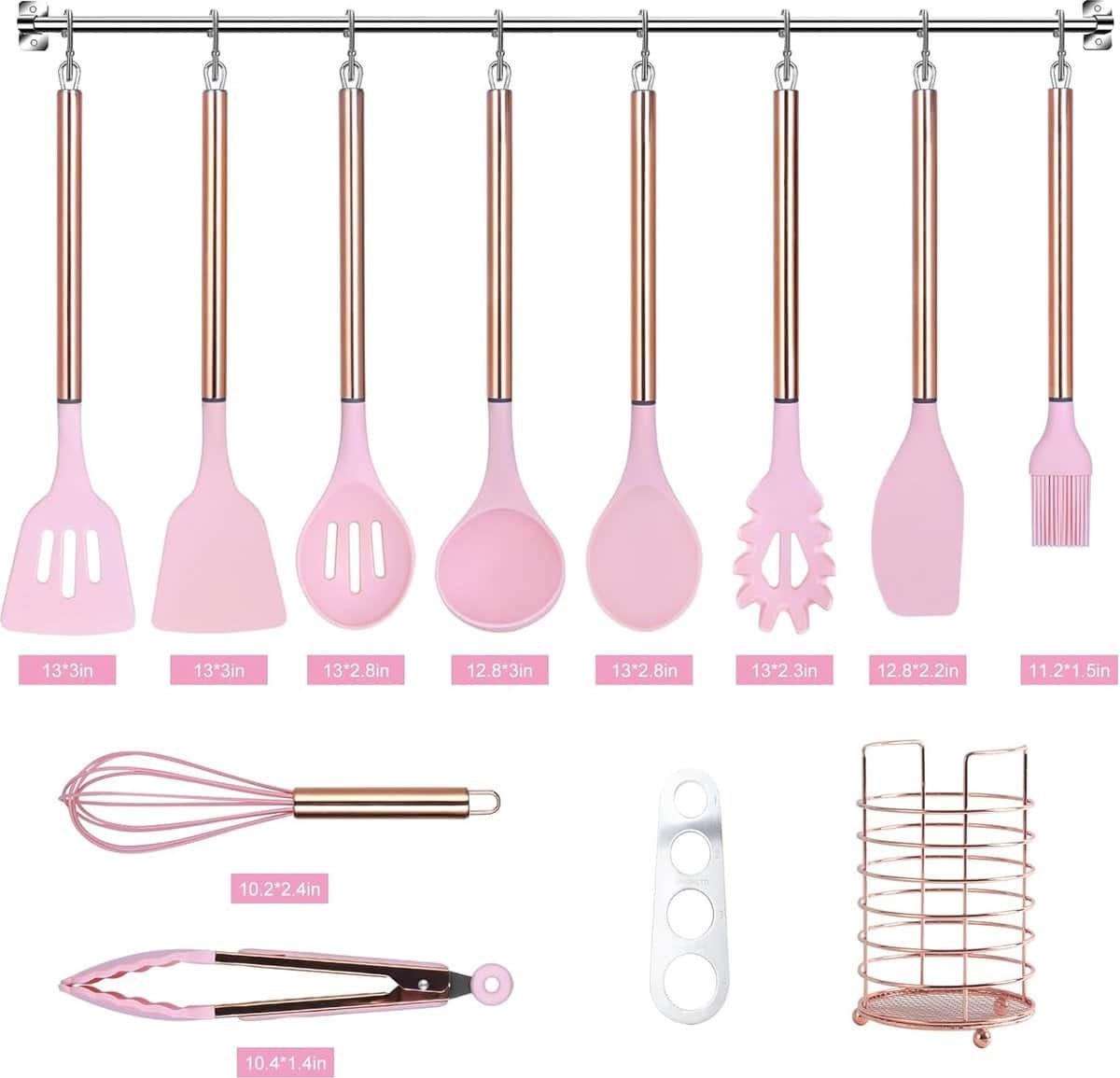 Keukengerei Set met houder, 22 stuks siliconen kookgerei set voor anti-aanbak kookgerei, hittebestendige spatel set, roestvrij stalen handvat keuken gadgets keukengerei set (roze)