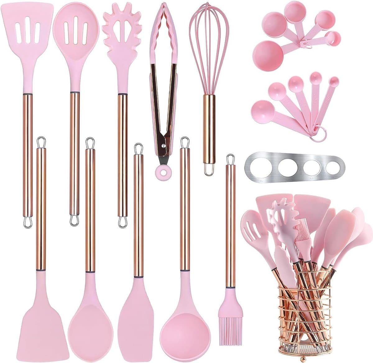 Keukengerei Set met houder, 22 stuks siliconen kookgerei set voor anti-aanbak kookgerei, hittebestendigheid spatel set, roestvrijstalen handvat keuken gadgets gebruiksvoorwerpen set (roze)