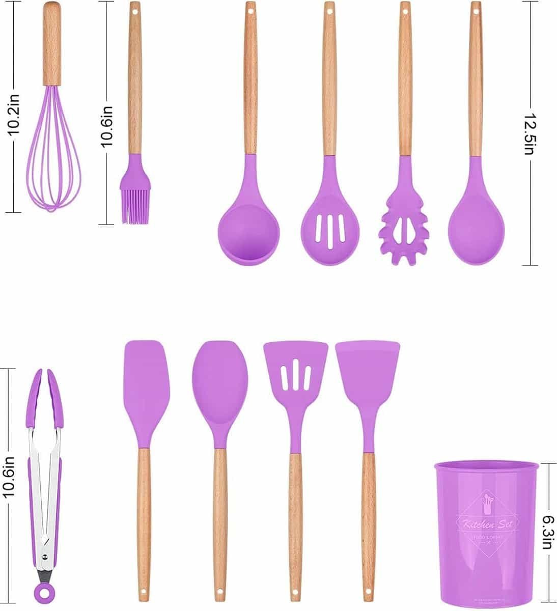Siliconen Kookgerei Keukengerei Set, 12 Stuks Natuurlijke Houten Handgrepen Koken Tool Bpa Gratis Niet Giftige Siliconen Turner Tang Spatel Lepel Keuken Gadgets Gebruiksvoorwerp Set (Paars)