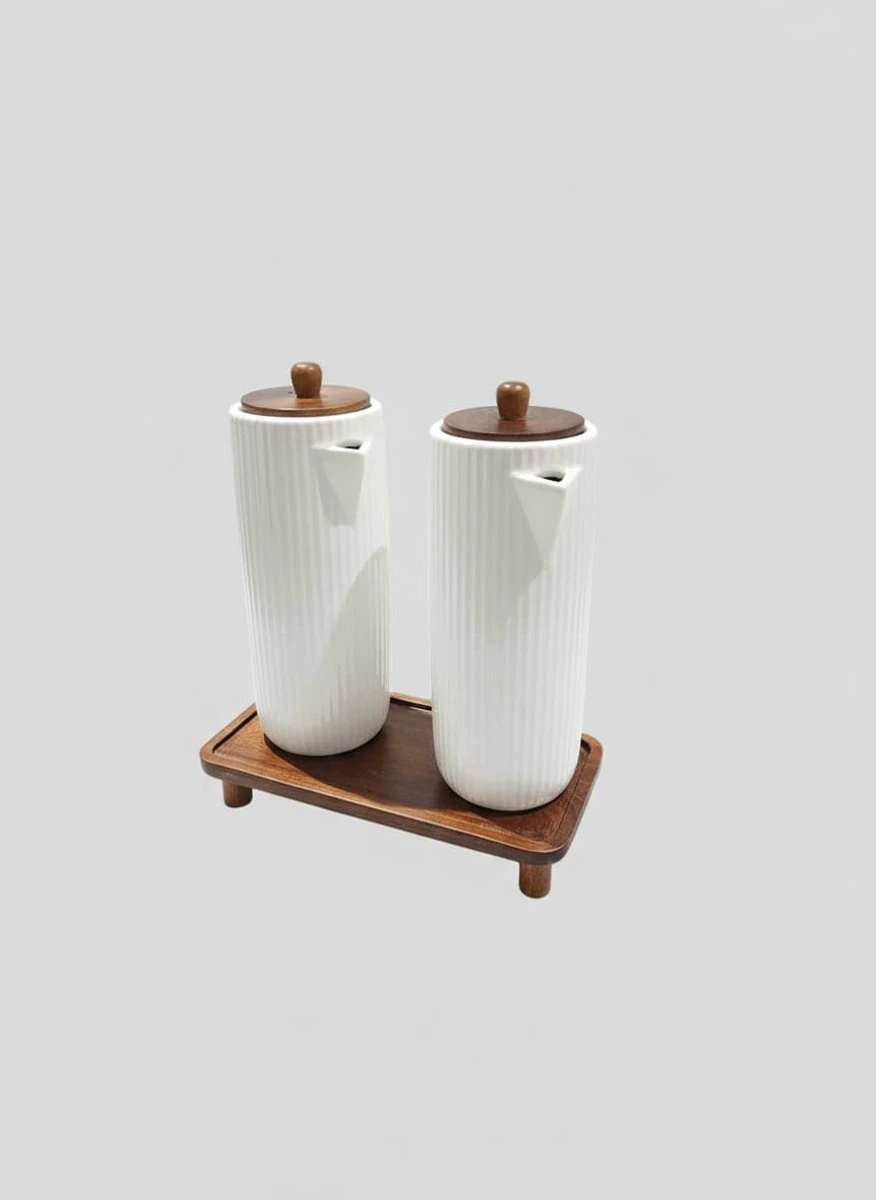 Breng stijl en gemak in jouw keuken met deze keramische olie- en azijnset van Bavary. De set bestaat uit twee elegante flessen van 400 ml, voorzien van een houten deksel en luxe tray.