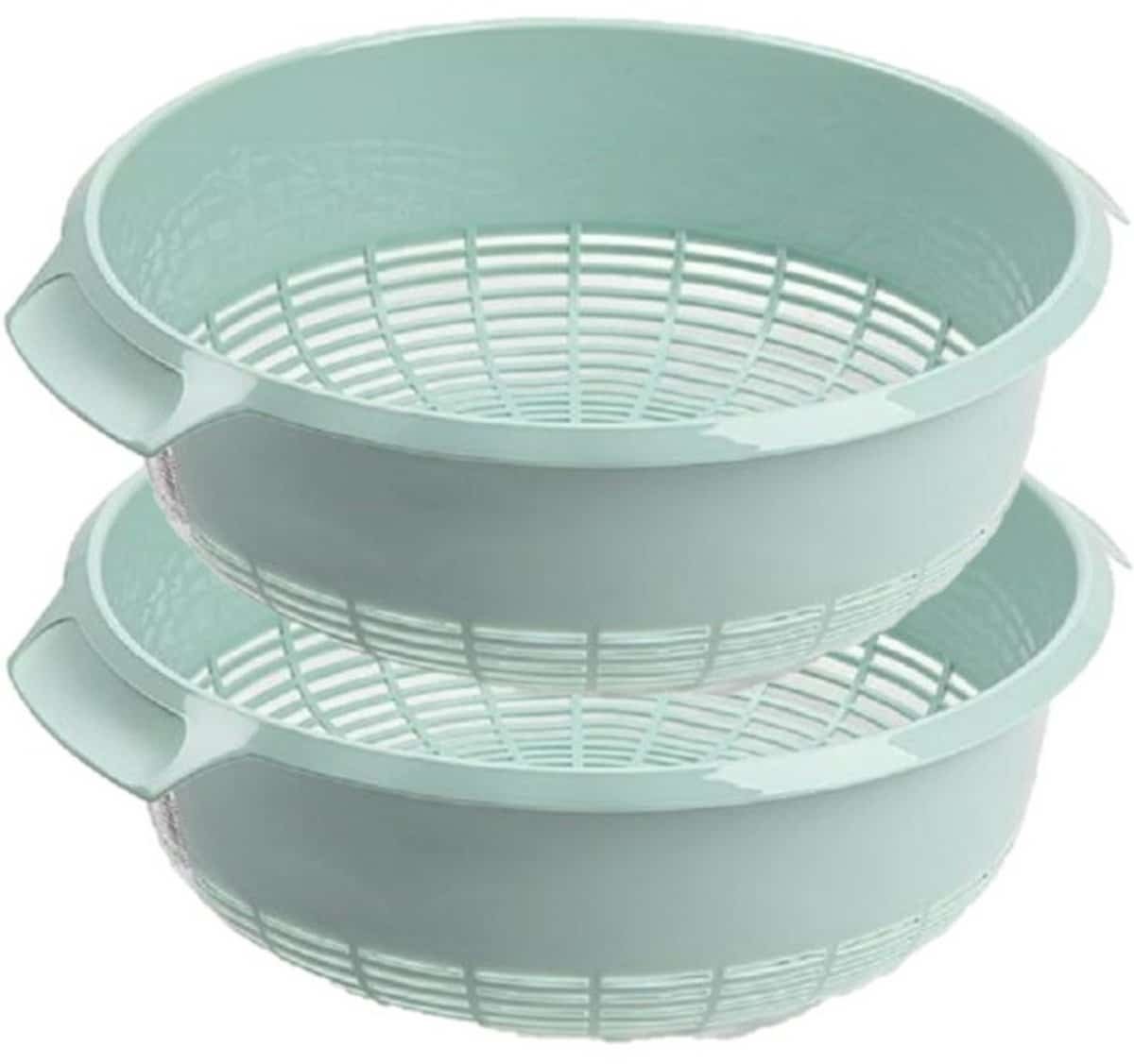2 stuks kunststof keuken vergieten van 27 x 10 cm in de kleur mintgroen. Afmeting incl. handvatten ca. 30 cm. Materiaal: stevig kunststof. Keuken accessoires.