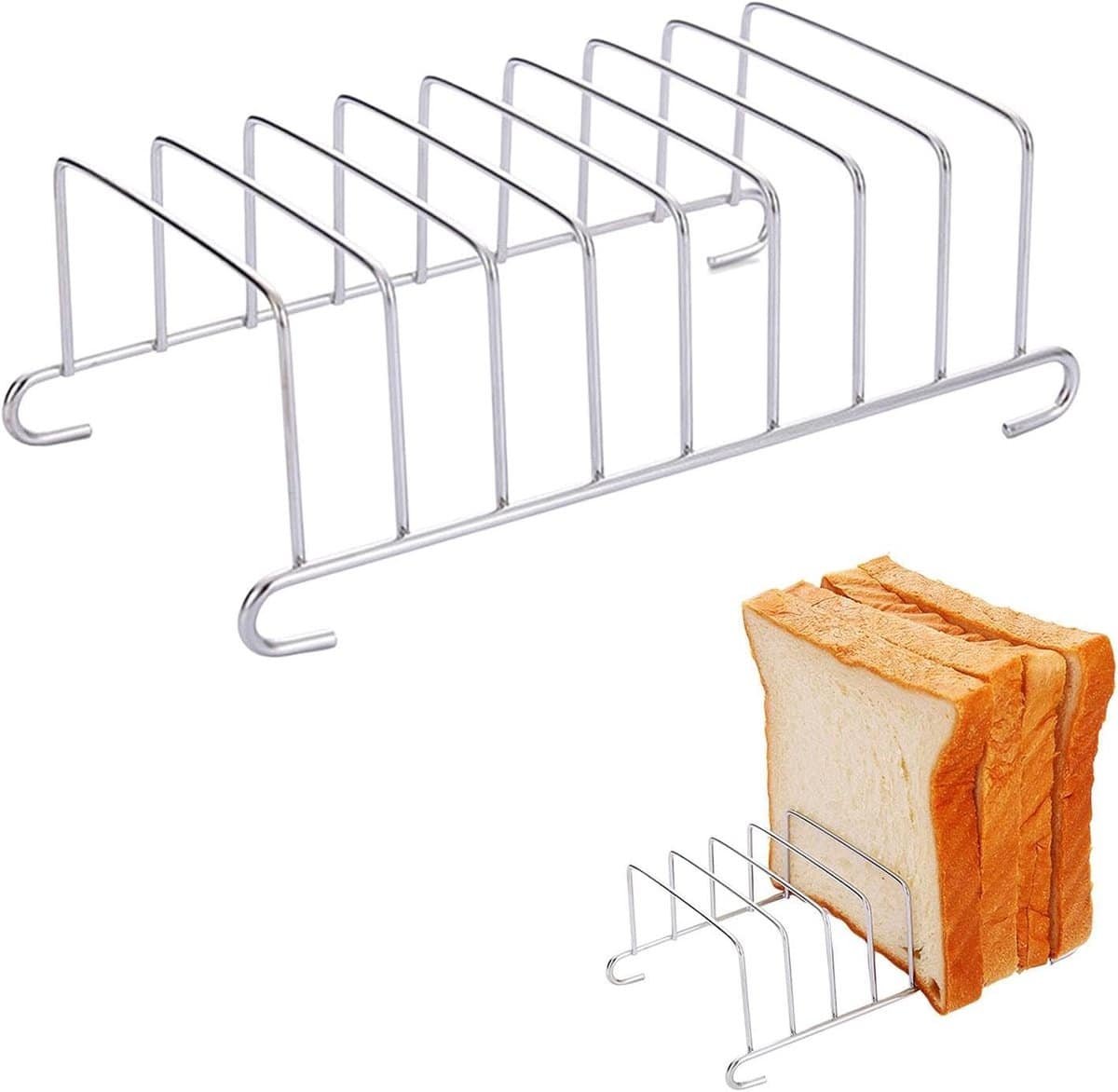 Praktische set van 2 RVS broodrooster accessoires met 8 sleuven, ideaal voor thuisgebruik in de keuken of voor restaurants en feestjes. Gemaakt van veilig en duurzaam roestvrij staal. De antiaanbaklaag zorgt voor eenvoudige reiniging en is vaatwasmachinebestendig. Dit stevige broodroosterrek past perfect bij uw airfryer en brood en vereist geen montage. Gemakkelijk in gebruik: simpelweg plaatsen en genieten. Afmetingen per stuk: 15,5 x 8,5 cm.