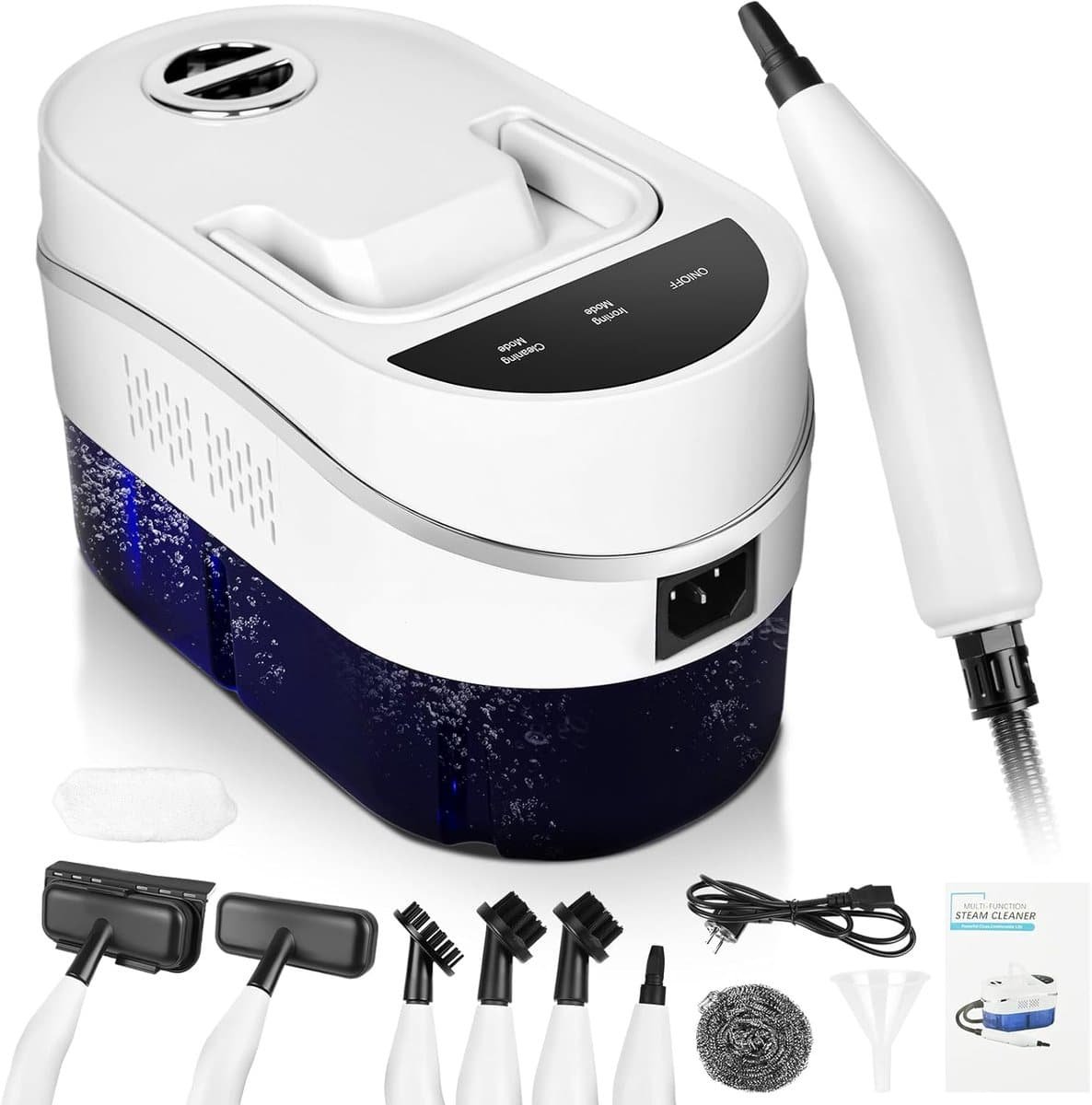 Multifunctionele draagbare reinigingsset: de stoomreiniger voor hoge temperatuur wordt geleverd met 5 professionele borstelkoppen (2 zachte kunststof borstels, draadborstelkop, glazen borstelkop, strijkmachineborstelkop), plug-and-play zonder gereedschap.